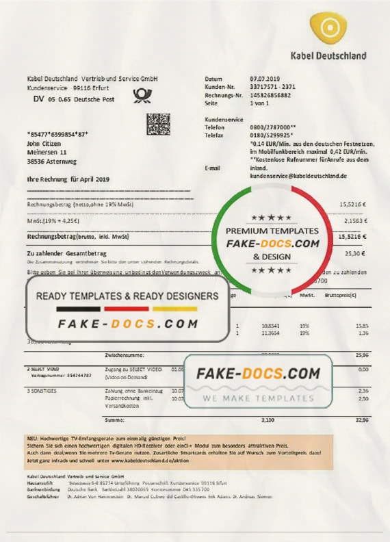 Grab now fully editable Germany TV Cabel utility bill Template from our website fake docs and put your own info to create a fake copy of Fake Germany TV Cabel Utility Bill for proof of address and ready your own novelty documents. It’ll be so beneficial if your utility bill is expired, stolen or not available. We also have passport psd template, ID Card psd template, Bank Statement psd template, drivers license psd template & Utility bill psd template