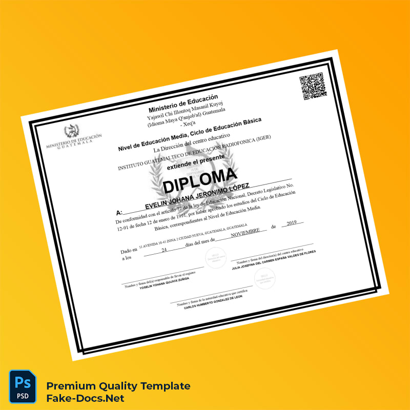 Our Guatemala Instituto Guatemalteco de Educación Radiofónica High School Diploma template is designed with print quality in mind. The file maintains sharp text and accurate colors, ensuring every detail reflects the original diploma perfectly. This high-resolution format guarantees your printed copy will be clear, professional, and suitable for archival purposes.