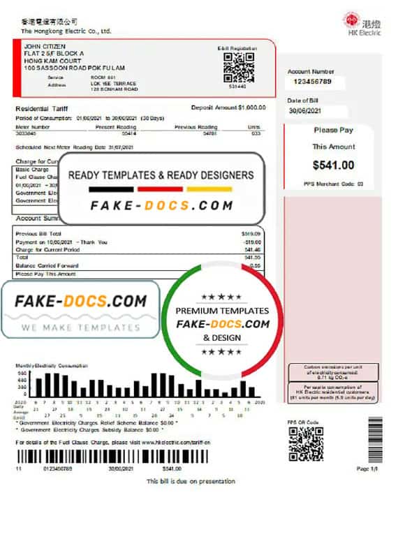 Grab now fully editable Hong Kong Hongkong Electric Company utility bill Template from our website fake docs and put your own info to create a fake copy of Fake Hong Kong Hongkong Electric Company Utility Bill for proof of address and ready your own novelty documents. It’ll be so beneficial if your utility bill is expired, stolen or not available. We also have passport psd template, ID Card psd template, Bank Statement psd template, drivers license psd template & Utility bill psd template