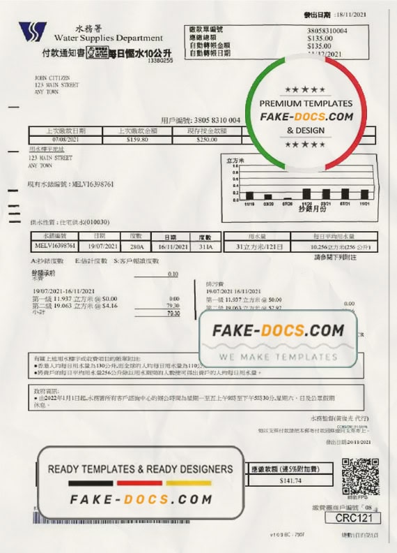 Grab now fully editable Hong Kong Water Supplies Department utility bill Template from our website fake docs and put your own info to create a fake copy of Fake Hong Kong Water Supplies Department Utility Bill for proof of address and ready your own novelty documents. It’ll be so beneficial if your utility bill is expired, stolen or not available. We also have passport psd template, ID Card psd template, Bank Statement psd template, drivers license psd template & Utility bill psd template
