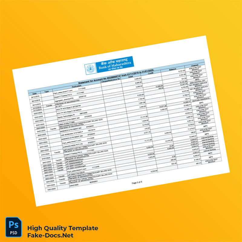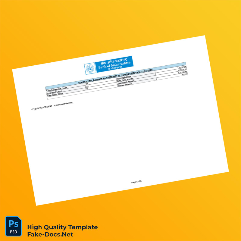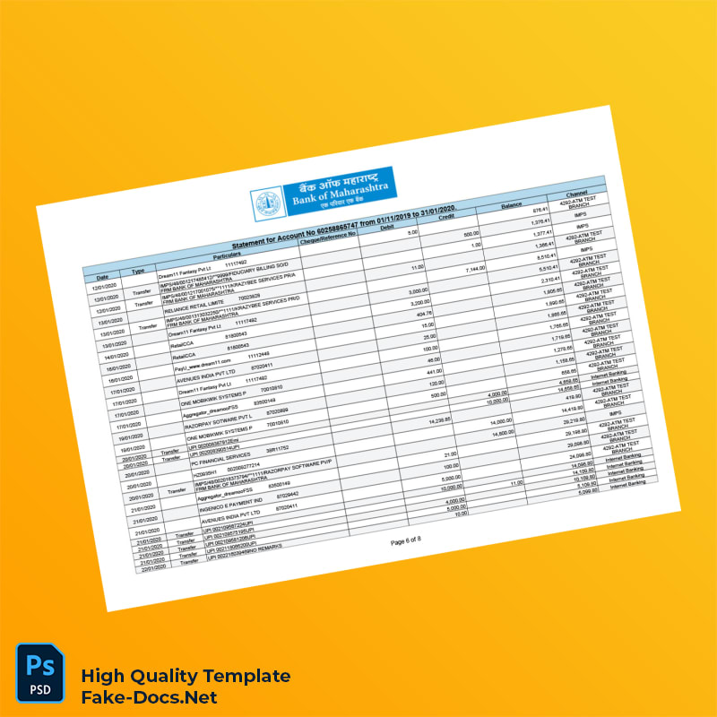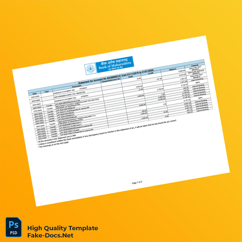 India Bank of Maharashtra Bank Statement Template in Word and PDF formats 8 page