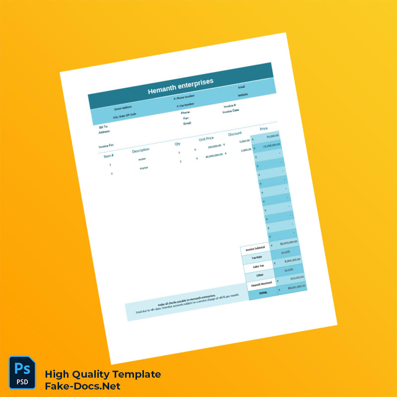 Streamline your billing process with the India Hemanth Enterprises Invoice Template, available in fully editable Word and PDF formats. Designed for creative and technical professionals worldwide, this template offers unmatched flexibility and professional appeal for generating precise invoices quickly and efficiently.