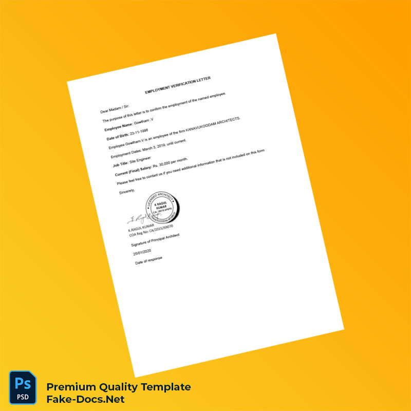 This template addresses core challenges such as document delay, outdated formats, and inconsistent verification lettering, helping you present validated employment proof with confidence and clarity. Whether managing large teams or personal employment records, the India KANAVUKOODAM ARCHITECTS Employment Verification Letter Template (Word & PDF) is crafted to reduce administrative workloads and improve verification accuracy.
