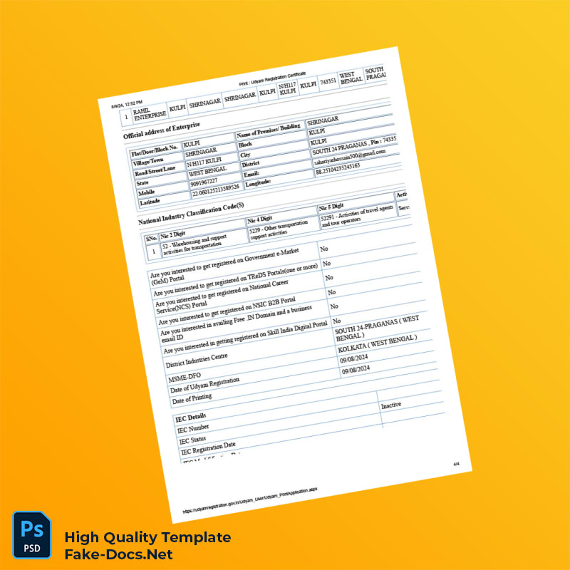 India Ministry of MSME Editable Udyam Registration Certificate Template