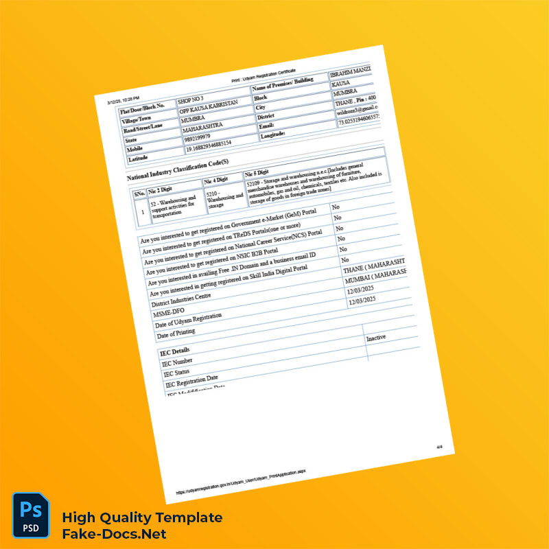 India Ministry of MSME Udyam Registration Certificate Template in Word and PDF Formats