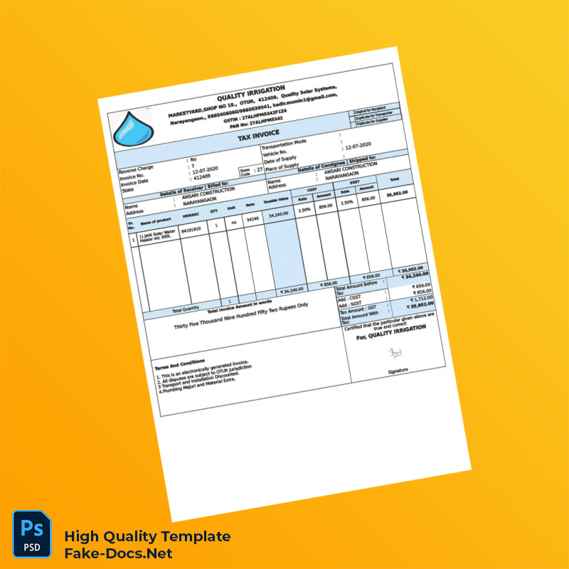India Quality Irrigation Tax Invoice Template in Word and PDF Formats