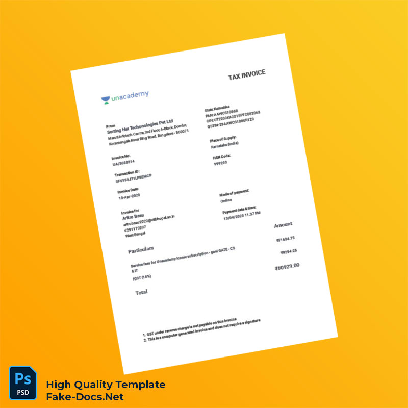 India Sorting Hat Technologies Pvt Ltd Tax Invoice Template in Word and PDF Formats