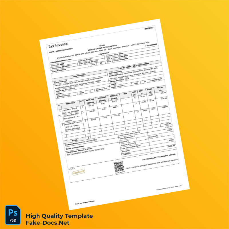 India Sriveda Sattva Private Limited Invoice Template: Seamless and Professional Billing Solution