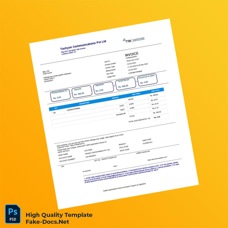 India Tachyon Communications Pvt Ltd Invoice Template in Word and PDF Formats