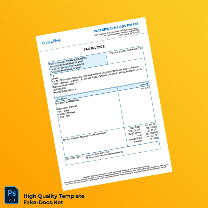 India Waterwala Labs Pvt Ltd Tax Invoice Template in Word and PDF formats