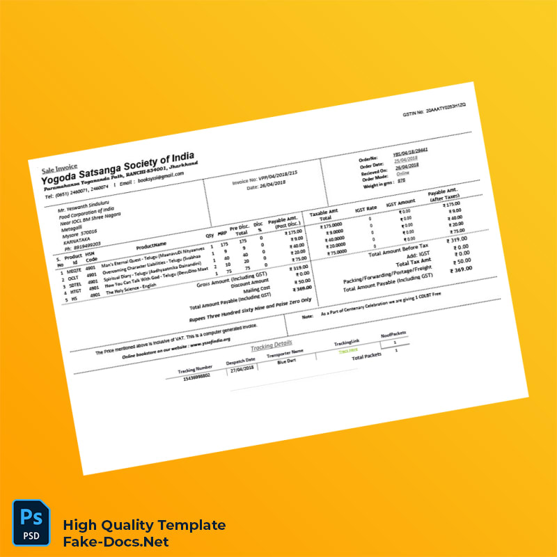 India Yogoda Satsanga Society of India Invoice Template – Editable Word and PDF Formats