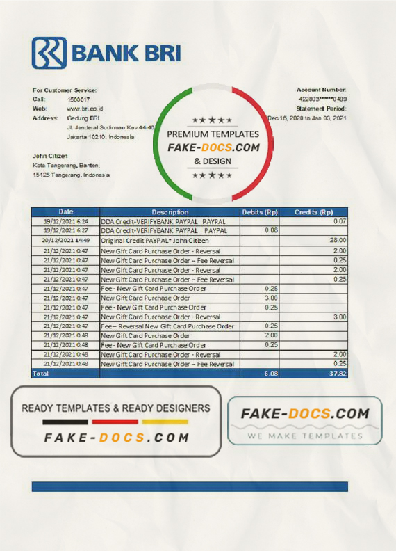 Grab now fully editable Indonesia Bank Rakyat Indonesia (BRI) Bank Statement Excel Template from our website Fake Docs and put your own info to create Fake Bank Statement template Excel and ready your own novelty documents. It’ll be so beneficial if your Bank Statement is expired, stolen or not available. We also have passport psd template, ID Card psd template, Bank Statement psd template, drivers license psd template & Utility bill psd template