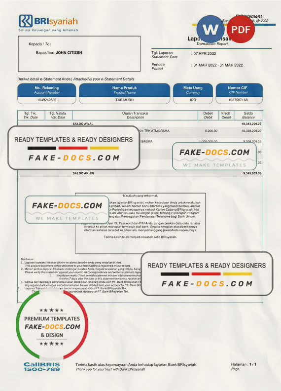 Indonesia BRIsyariah Bank Statement Word template . Fully editable Word  template. High quality template. Easy to customize, Layer based, fonts included. you can edit this template and  put any name, address, license number, Id number, birth date, height, weight, expire date, change photos etc. This Word  template is a easy to Editing.To modify this Word template file you will need a Word editing software such as Microsoft Word. Never used low quality template. Your account may be suspended.