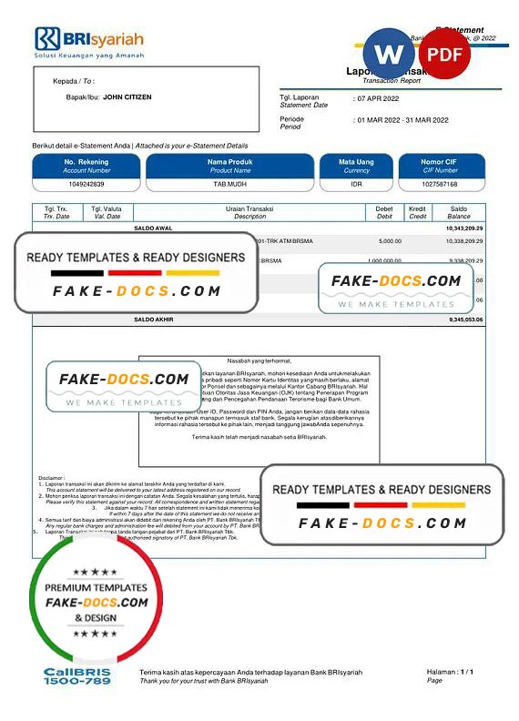 Indonesia BRIsyariah bank e-Statement, Word and PDF template
