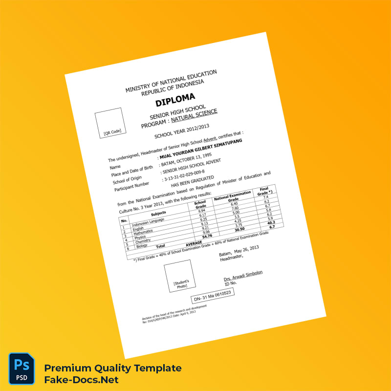 Indonesia Senior High School Advent High School Diploma – High Quality Replacement Template