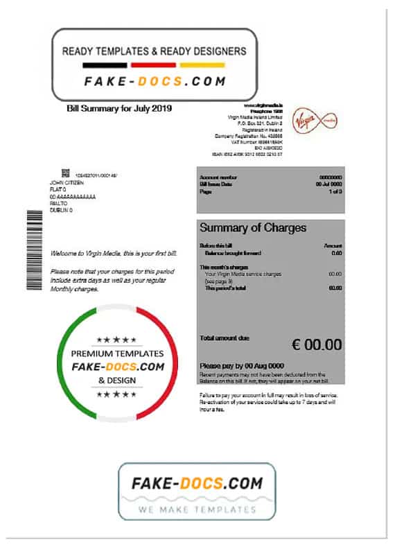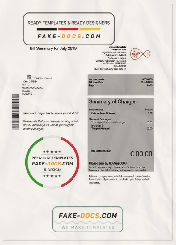 Grab now fully editable Ireland Virgin Media utility bill Template from our website fake docs and put your own info to create a fake copy of Fake Ireland Virgin Media Utility Bill for proof of address and ready your own novelty documents. It’ll be so beneficial if your utility bill is expired, stolen or not available. We also have passport psd template, ID Card psd template, Bank Statement psd template, drivers license psd template & Utility bill psd template