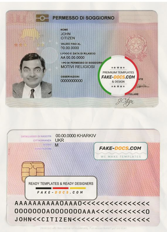 Italy residence permit card Psd Template. Fully editable photoshop template. High quality template. Easy to customize, Layer based, fonts included. you can edit this template and  put any name, address, license number, Id number, birth date, height, weight, expire date, change photos etc. This Photoshop template is a layer based psd file and it’s easy to Editing.To modify this photoshop template file you will need a Photo editing software such as Adobe Photoshop No need to be expert on editing software like adobe Photoshop. However, You just have to basic knowledge on adobe photoshop, to edit this template. Never used low quality template. Your account may be suspended.