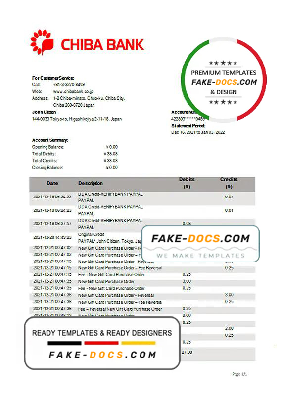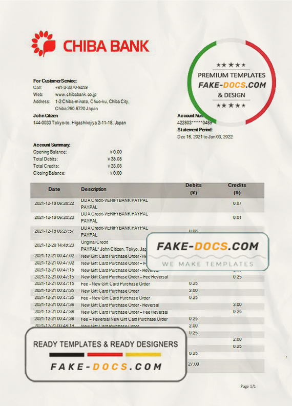 Grab now fully editable Japan Chiba Bank Statement Word Template from our website Fake Docs and put your own info to create Fake Bank Statement Word template and ready your own novelty documents. It’ll be so beneficial if your Bank Statement is expired, stolen or not available. We also have passport psd template, ID Card psd template, Bank Statement psd template, drivers license psd template & Utility bill psd template