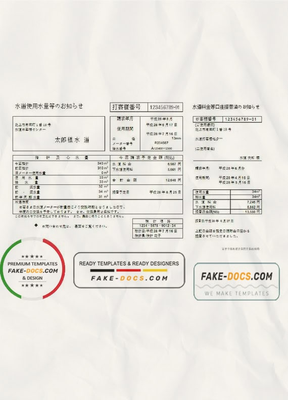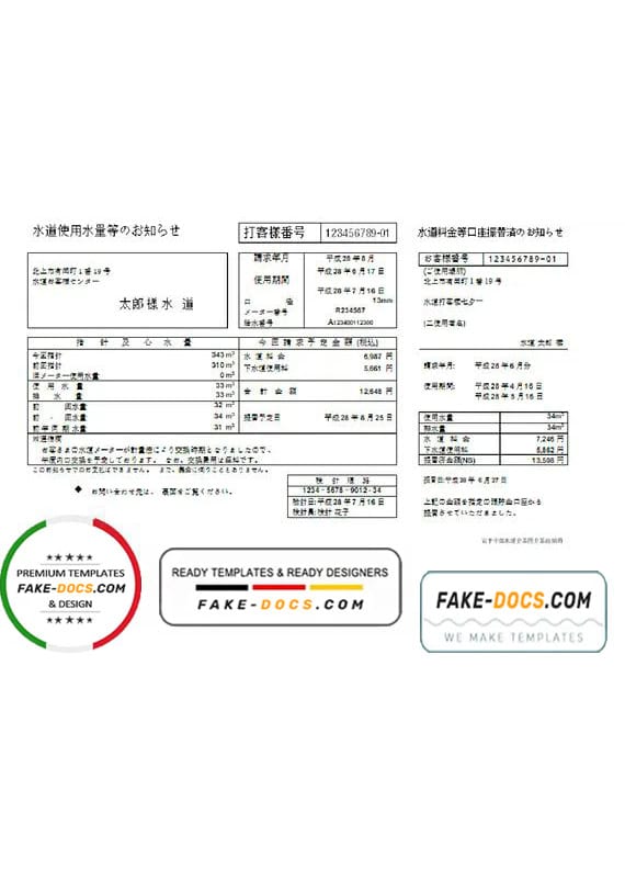 Grab now fully editable Japan Iwate Chubu Waterworks Bureau water utility bill Template from our website fake docs and put your own info to create a fake copy of Fake Japan Iwate Chubu Waterworks Bureau water Utility Bill for proof of address and ready your own novelty documents. It’ll be so beneficial if your utility bill is expired, stolen or not available. We also have passport psd template, ID Card psd template, Bank Statement psd template, drivers license psd template & Utility bill psd template