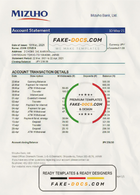 Grab now fully editable Japan Mizuho Bank Statement Excel Template from our website Fake Docs and put your own info to create Fake Bank Statement template Excel and ready your own novelty documents. It’ll be so beneficial if your Bank Statement is expired, stolen or not available. We also have passport psd template, ID Card psd template, Bank Statement psd template, drivers license psd template & Utility bill psd template