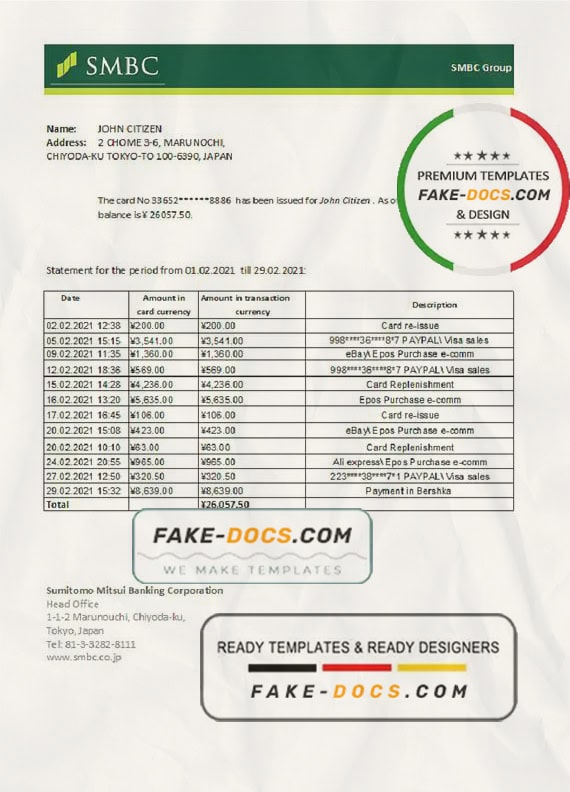 Grab now fully editable Japan Sumitomo Mitsui Banking Corporation (SMBC) Bank Statement Excel Template from our website Fake Docs and put your own info to create Fake Bank Statement template Excel and ready your own novelty documents. It’ll be so beneficial if your Bank Statement is expired, stolen or not available. We also have passport psd template, ID Card psd template, Bank Statement psd template, drivers license psd template & Utility bill psd template