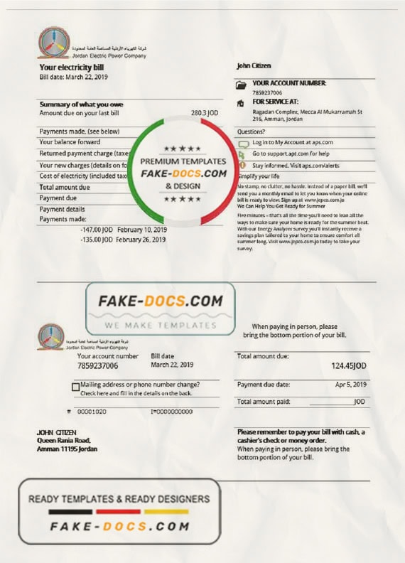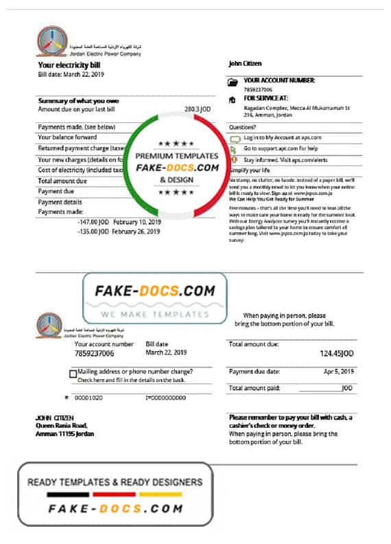 Grab now fully editable Jordan Jordanian Electric Power Co JEPCO electricity utility bill Template from our website fake docs and put your own info to create a fake copy of Fake Jordan Jordanian Electric Power Co JEPCO electricity Utility Bill for proof of address and ready your own novelty documents. It’ll be so beneficial if your utility bill is expired, stolen or not available. We also have passport psd template, ID Card psd template, Bank Statement psd template, drivers license psd template & Utility bill psd template