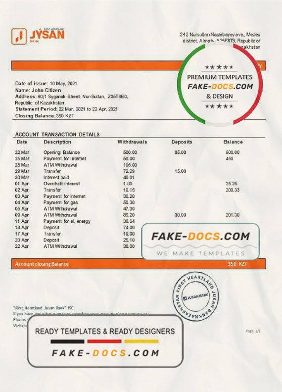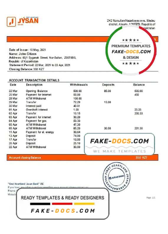 Grab now fully editable Kazakhstan First Heartland Jusan bank proof of address Bank Statement Word Template from our website Fake Docs and put your own info to create Fake Bank Statement Word template and ready your own novelty documents. It’ll be so beneficial if your Bank Statement is expired, stolen or not available. We also have passport psd template, ID Card psd template, Bank Statement psd template, drivers license psd template & Utility bill psd template