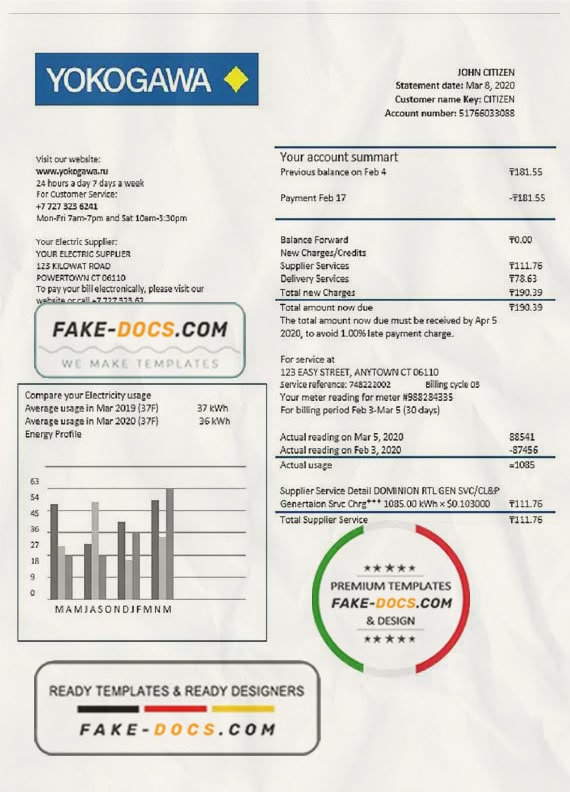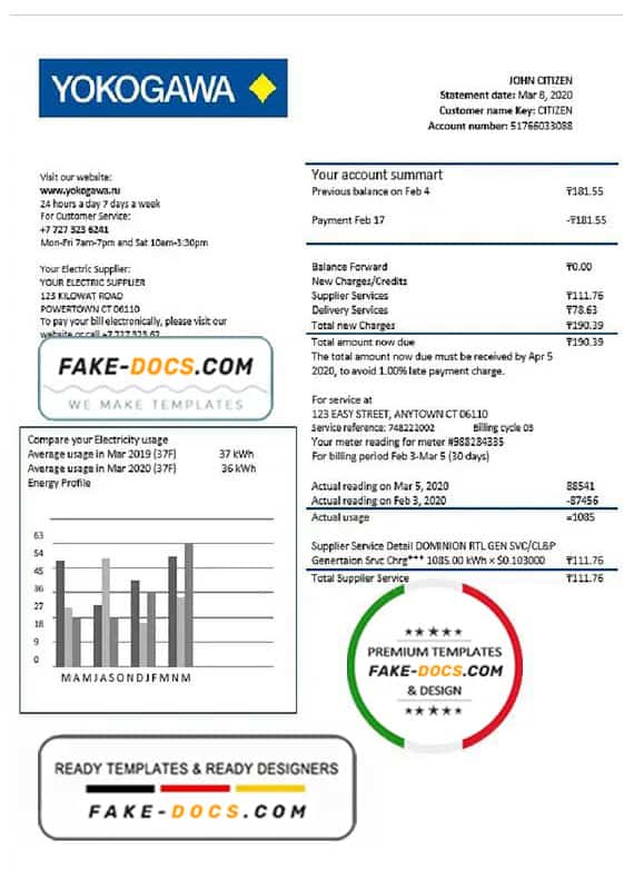 Kazakhstan Yokogawa Electric Kazakhstan utility bill Word template . Fully editable Word  template. High quality template. Easy to customize, Layer based, fonts included. you can edit this template and  put any name, address, license number, Id number, birth date, height, weight, expire date etc. This Word  template is a easy to Editing.To modify this Word template file you will need a Word editing software such as Microsoft Word. Never used low quality template. Your account may be suspended.