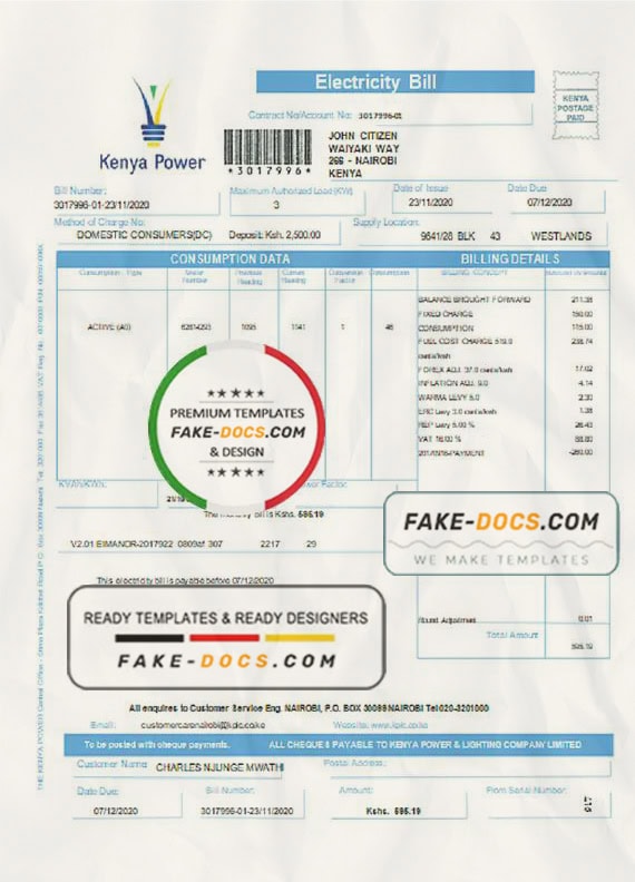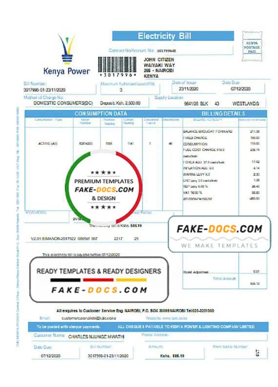 Grab now fully editable Kenya Power utility bill Template from our website fake docs and put your own info to create a fake copy of Fake Kenya Power Utility Bill for proof of address and ready your own novelty documents. It’ll be so beneficial if your utility bill is expired, stolen or not available. We also have passport psd template, ID Card psd template, Bank Statement psd template, drivers license psd template & Utility bill psd template
