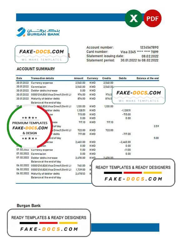 Grab now fully editable Kuwait Burgan Bank Statement Excel Template from our website Fake Docs and put your own info to create Fake Bank Statement template Excel and ready your own novelty documents. It’ll be so beneficial if your Bank Statement is expired, stolen or not available. We also have passport psd template, ID Card psd template, Bank Statement psd template, drivers license psd template & Utility bill psd template