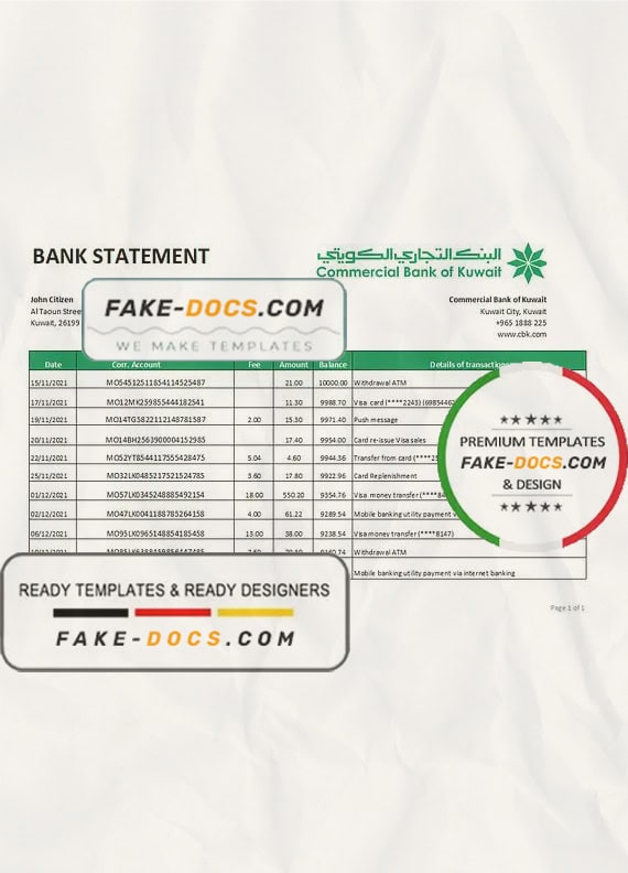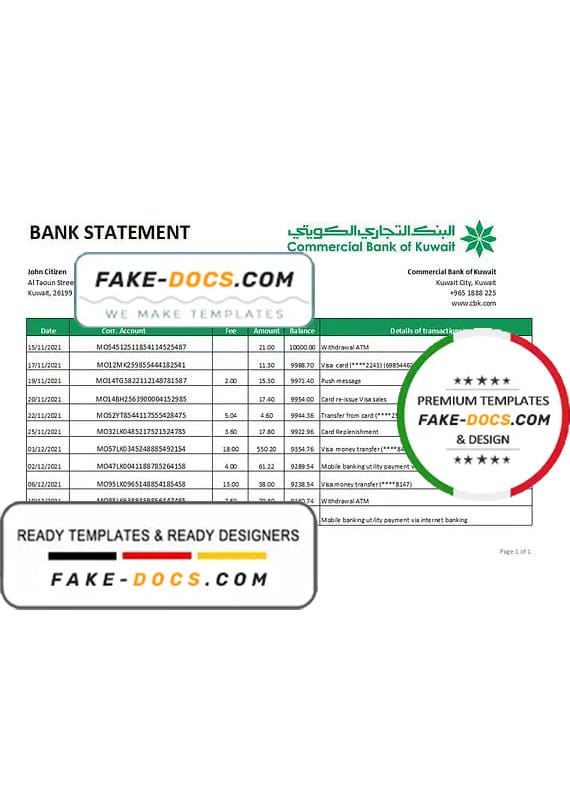 Grab now fully editable Kuwait Commercial Bank Statement Excel Template from our website Fake Docs and put your own info to create Fake Bank Statement template Excel and ready your own novelty documents. It’ll be so beneficial if your Bank Statement is expired, stolen or not available. We also have passport psd template, ID Card psd template, Bank Statement psd template, drivers license psd template & Utility bill psd template