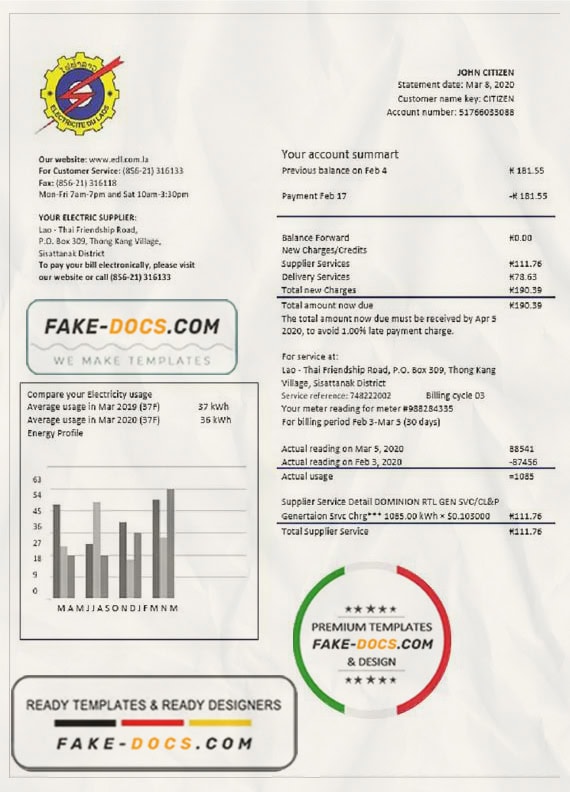 Laos Electricite du Laos electricity utility bill Word template . Fully editable Word template. High quality template. Easy to customize, Layer based, fonts included. you can edit this template and put any name, address, license number, Id number, birth date, height, weight, expire date etc. This Word template is a easy to Editing.To modify this Word template file you will need a Word editing software such as Microsoft Word. Never used low quality template. Your account may be suspended.
