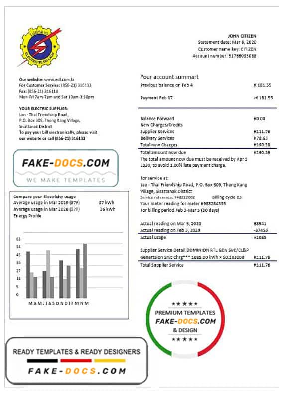 Grab now fully editable Laos Electricite du Laos electricity utility bill Template from our website fake docs and put your own info to create a fake copy of Fake Laos Electricite du Laos electricity Utility Bill for proof of address and ready your own novelty documents. It’ll be so beneficial if your utility bill is expired, stolen or not available. We also have passport psd template, ID Card psd template, Bank Statement psd template, drivers license psd template & Utility bill psd template