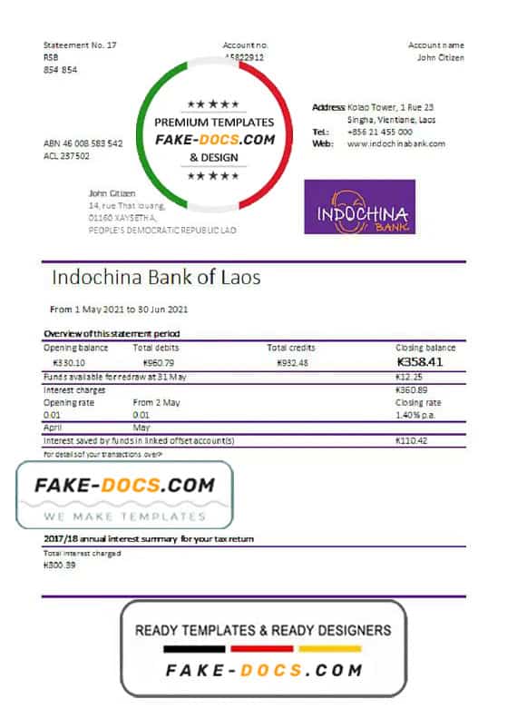 Laos Indochina Bank Statement template Excel. Fully editable Excel template. High quality template. Easy to customize, fonts included. you can edit this template and put any name, address, license number, Id number, birth date, height, weight, expire date, change photos etc. This Excel template is a easy to Editing.To modify this Excel template file you will need a Excel editing software such as Microsoft Excel. Never used low quality template. Your account may be suspended.