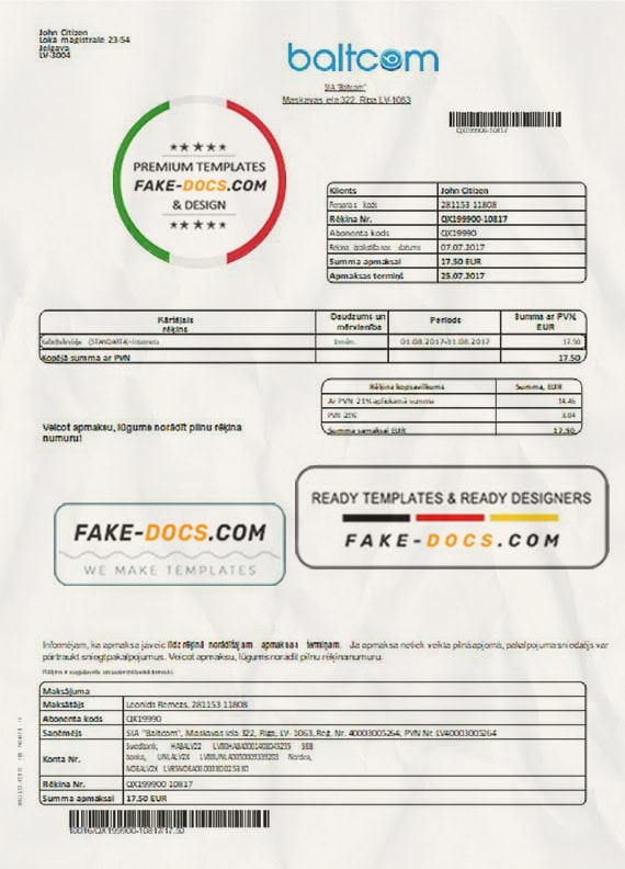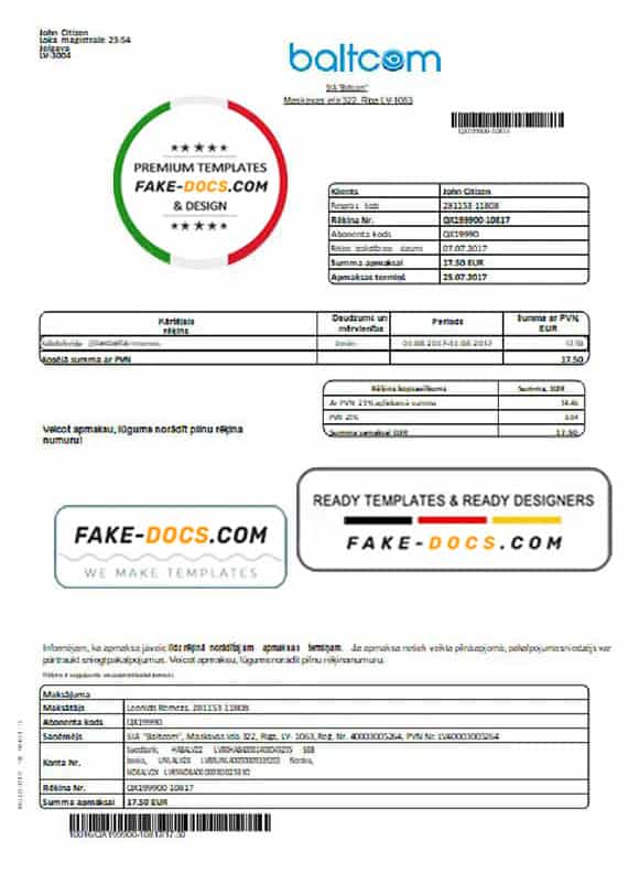 Grab now fully editable Latvia Baltcom telecommunications utility bill Template from our website fake docs and put your own info to create a fake copy of Fake Latvia Baltcom telecommunications Utility Bill for proof of address and ready your own novelty documents. It’ll be so beneficial if your utility bill is expired, stolen or not available. We also have passport psd template, ID Card psd template, Bank Statement psd template, drivers license psd template & Utility bill psd template