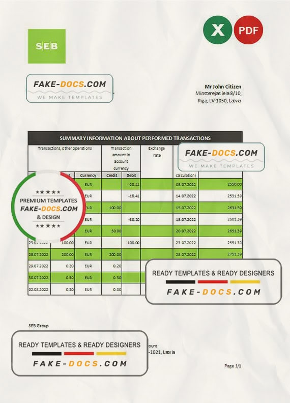 Grab now fully editable Latvia SEB Bank Statement Excel Template from our website Fake Docs and put your own info to create Fake Bank Statement template Excel and ready your own novelty documents. It’ll be so beneficial if your Bank Statement is expired, stolen or not available. We also have passport psd template, ID Card psd template, Bank Statement psd template, drivers license psd template & Utility bill psd template
