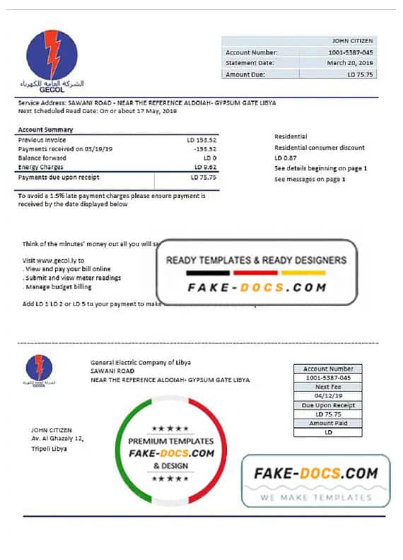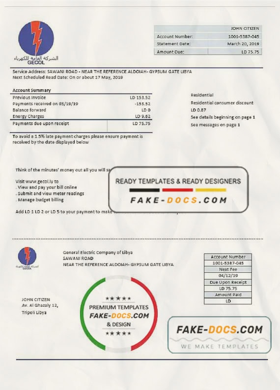 Grab now fully editable Libya General Electric Company electricity utility bill Template from our website fake docs and put your own info to create a fake copy of Fake Libya General Electric Company electricity Utility Bill for proof of address and ready your own novelty documents. It’ll be so beneficial if your utility bill is expired, stolen or not available. We also have passport psd template, ID Card psd template, Bank Statement psd template, drivers license psd template & Utility bill psd template