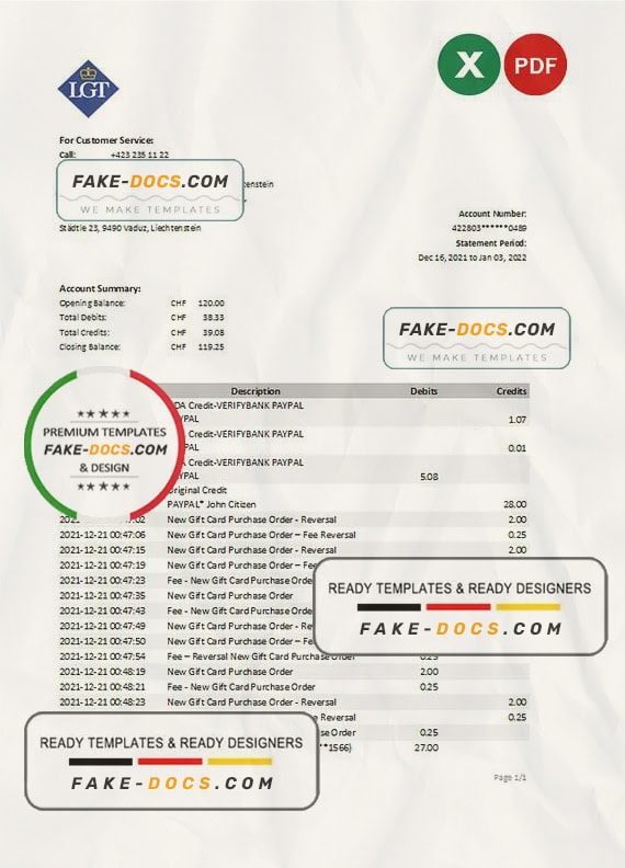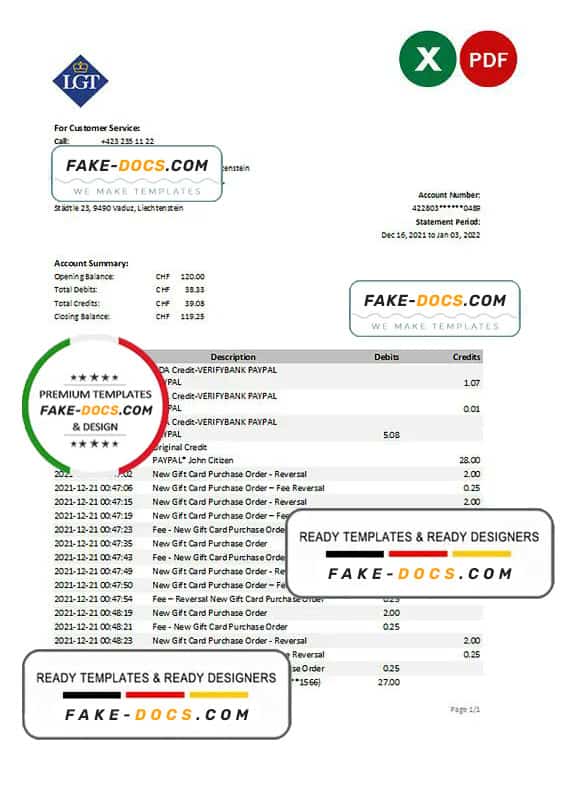 Grab now fully editable Liechtenstein LGT Bank Statement Excel Template from our website Fake Docs and put your own info to create Fake Bank Statement template Excel and ready your own novelty documents. It’ll be so beneficial if your Bank Statement is expired, stolen or not available. We also have passport psd template, ID Card psd template, Bank Statement psd template, drivers license psd template & Utility bill psd template