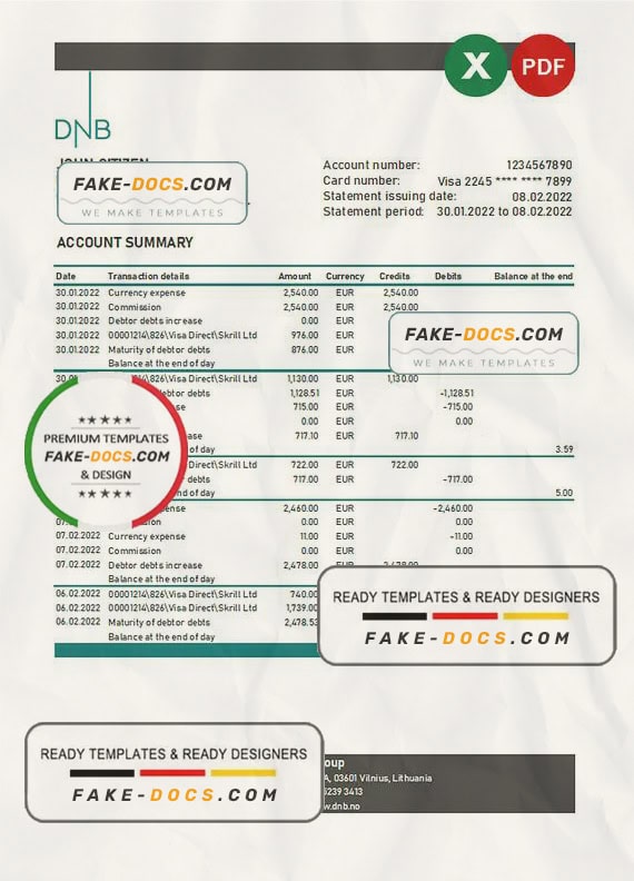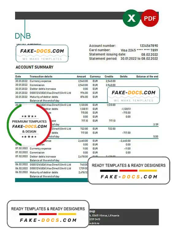Lithuania DNB Bank Statement template Excel. Fully editable Excel template. High quality template. Easy to customize, fonts included. you can edit this template and  put any name, address, license number, Id number, birth date, height, weight, expire date, change photos etc. This Excel template is a easy to Editing.To modify this Excel template file you will need a Excel editing software such as Microsoft Excel. Never used low quality template. Your account may be suspended.
