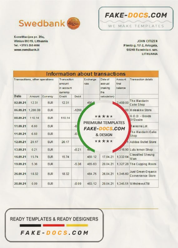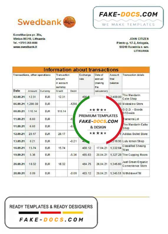 Grab now fully editable Lithuania Swedbank Bank Statement Excel Template from our website Fake Docs and put your own info to create Fake Bank Statement template Excel and ready your own novelty documents. It’ll be so beneficial if your Bank Statement is expired, stolen or not available. We also have passport psd template, ID Card psd template, Bank Statement psd template, drivers license psd template & Utility bill psd template