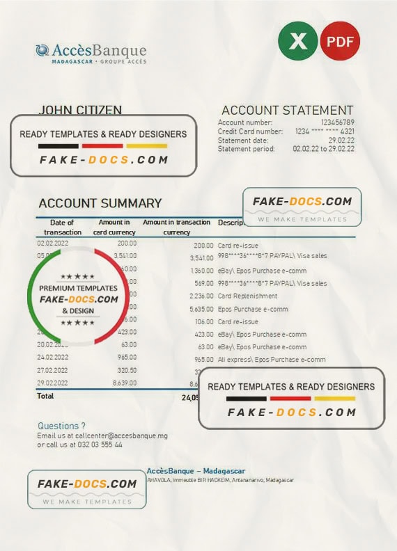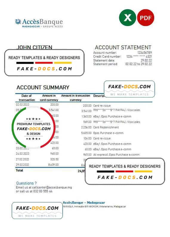 Grab now fully editable Madagascar Acces Banque Bank Statement Excel Template from our website Fake Docs and put your own info to create Fake Bank Statement template Excel and ready your own novelty documents. It’ll be so beneficial if your Bank Statement is expired, stolen or not available. We also have passport psd template, ID Card psd template, Bank Statement psd template, drivers license psd template & Utility bill psd template
