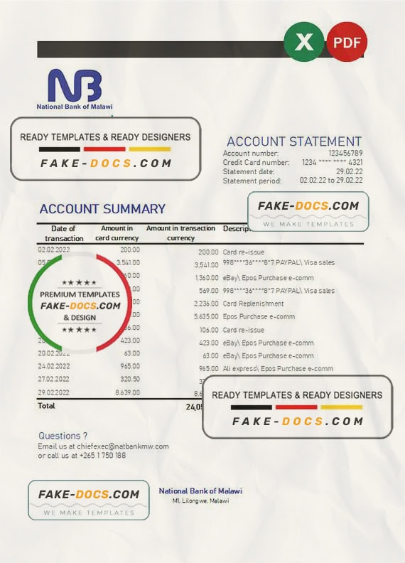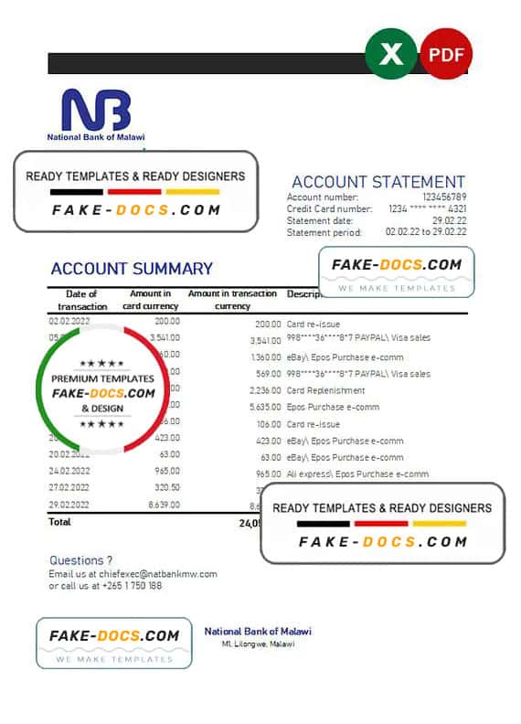 Grab now fully editable Malawi National Bank of Malawi Bank Statement Excel Template from our website Fake Docs and put your own info to create Fake Bank Statement template Excel and ready your own novelty documents. It’ll be so beneficial if your Bank Statement is expired, stolen or not available. We also have passport psd template, ID Card psd template, Bank Statement psd template, drivers license psd template & Utility bill psd template