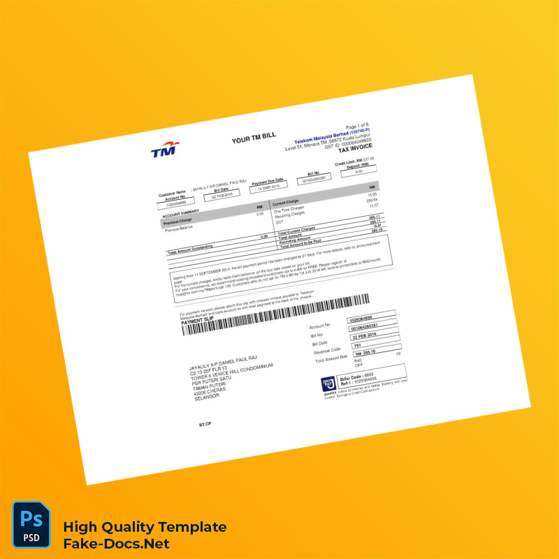 Malaysia Telekom Editable Utility Bill Template in Word and PDF formats