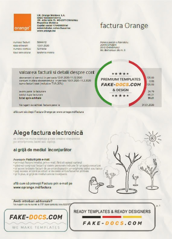 Grab now fully editable Moldova Orange Factura utility bill Template from our website fake docs and put your own info to create a fake copy of Fake Moldova Orange Factura Utility Bill for proof of address and ready your own novelty documents. It’ll be so beneficial if your utility bill is expired, stolen or not available. We also have passport psd template, ID Card psd template, Bank Statement psd template, drivers license psd template & Utility bill psd template