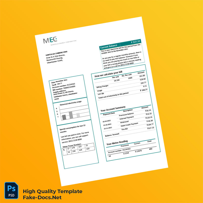 Mongolia Mongolia Energy Corporation Editable Electricity Bill Template in Word and PDF formats