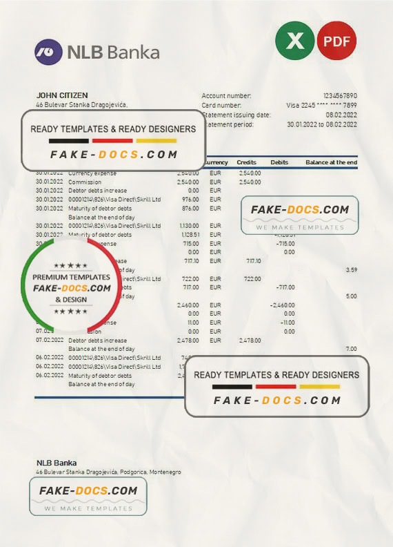 Grab now fully editable Montenegro NLB Bank Statement Excel Template from our website Fake Docs and put your own info to create Fake Bank Statement template Excel and ready your own novelty documents. It’ll be so beneficial if your Bank Statement is expired, stolen or not available. We also have passport psd template, ID Card psd template, Bank Statement psd template, drivers license psd template & Utility bill psd template
