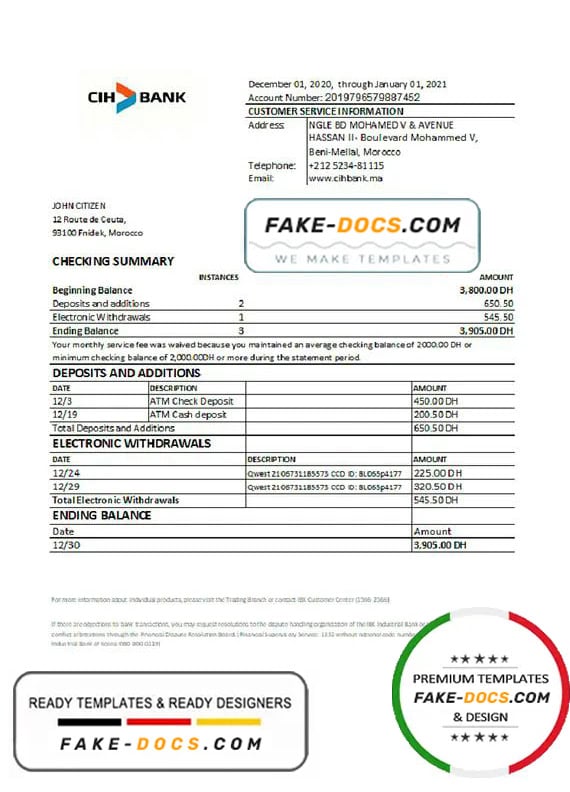 Grab now fully editable Morocco CIH Bank Statement Excel Template from our website Fake Docs and put your own info to create Fake Bank Statement template Excel and ready your own novelty documents. It’ll be so beneficial if your Bank Statement is expired, stolen or not available. We also have passport psd template, ID Card psd template, Bank Statement psd template, drivers license psd template & Utility bill psd template