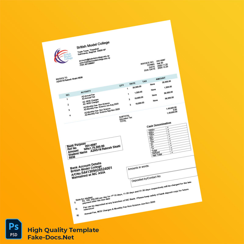 Nepal British Model College Invoice Template: Professional & Editable in Word and PDF