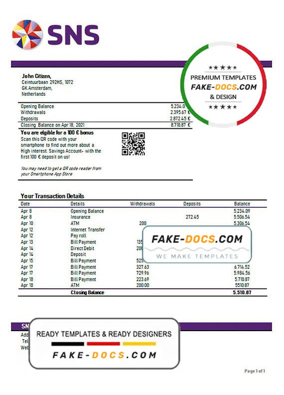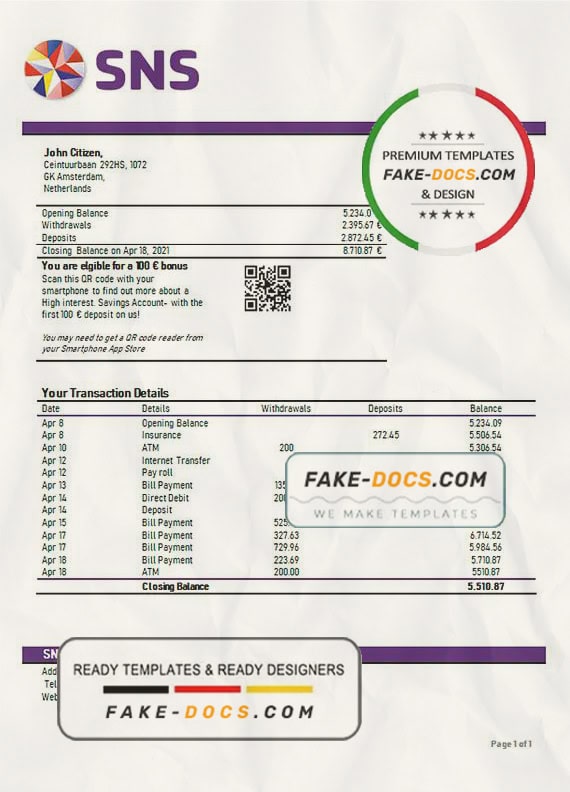 Netherlands SNS Bank Statement Word and Pdf Template use for :