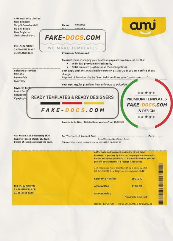Grab now fully editable New Zealand Ami Insurance Limited Bank Statement Word Template from our website Fake Docs and put your own info to create Fake Bank Statement Word template and ready your own novelty documents. It’ll be so beneficial if your Bank Statement is expired, stolen or not available. We also have passport psd template, ID Card psd template, Bank Statement psd template, drivers license psd template & Utility bill psd template